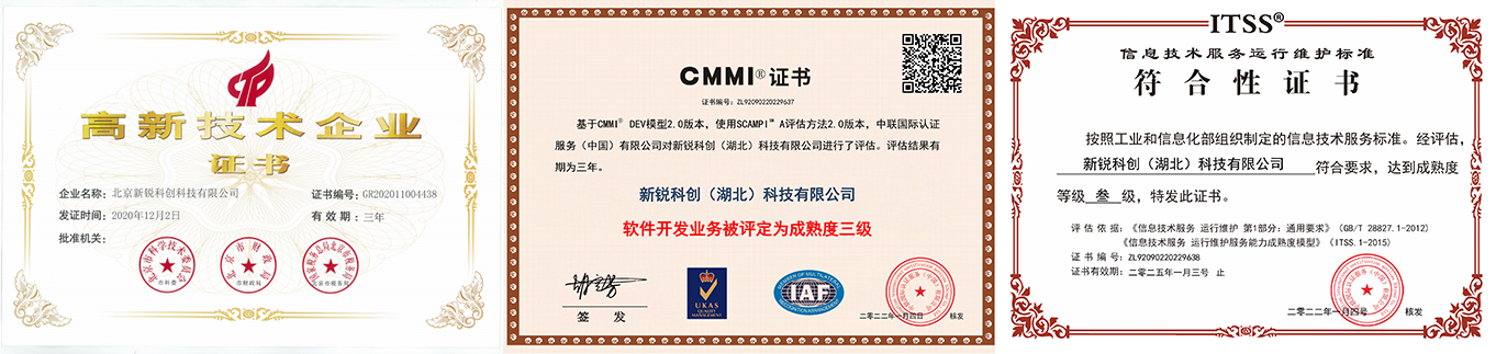 新锐科创获得了20+项企业认证,包括:高新技术企业、瞪羚企业、AAA级信用企业、ISO管理体系认证等。