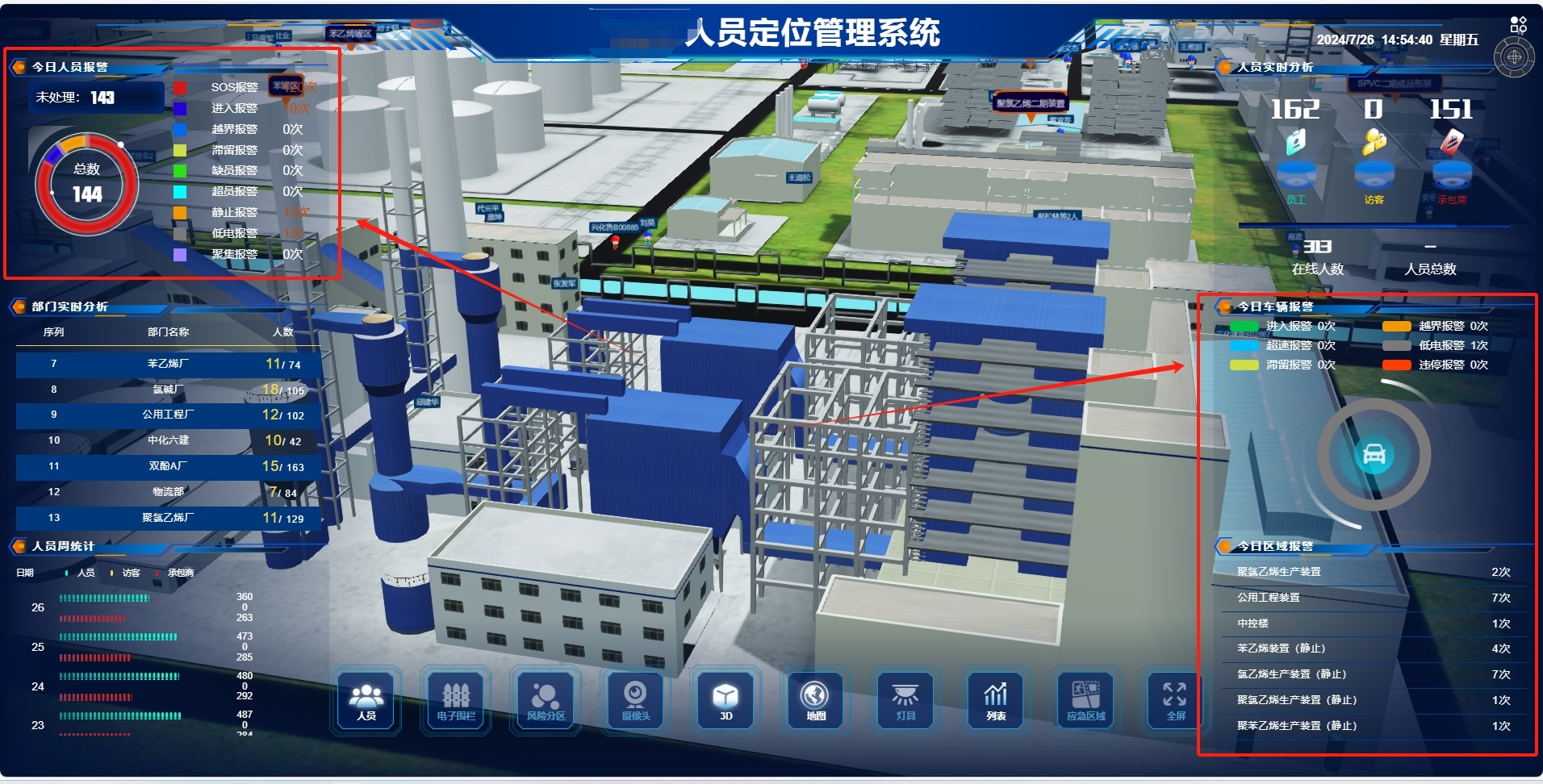 在软件功能方面,新锐科创人员定位系统具备完善的安全管控功能,涵盖实时跟踪定位、历史轨迹查询、电子围栏、风险预警管理、智能应急救援、视频监控联动、GIS大数据可视化等核心功能,可全面满足石油化工企业人员安全管控的各项需求。系统后台采用3D可视化展示引擎,可构建厂区三维模型,实现人员位置的沉浸式展示,管理人员可通过2D/3D地图自由切换,清晰掌握人员分布与作业状态;历史轨迹查询功能可追溯指定人员在指定时间内的活动轨迹,为事件分析提供可视化数据支撑;智能应急救援功能可与定位卡一键呼救功能联动,快速锁定受困人员位置,助力救援工作高效开展。