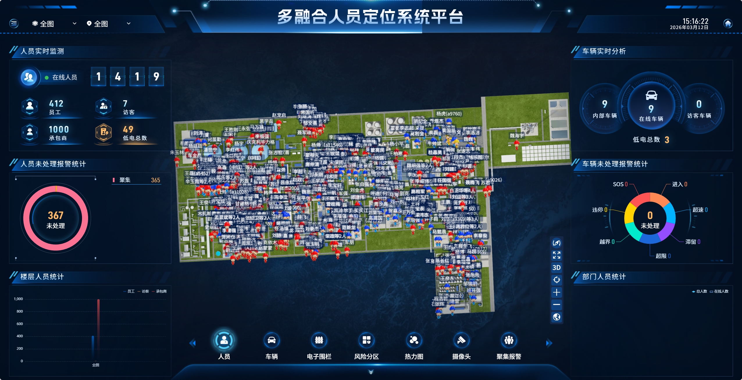 新锐科创人车定位系统集成实时定位、电子围栏、轨迹回放、智能预警、车辆调度、数据分析等全功能模块。管理平台基于GIS技术构建园区2D/3D数字孪生模型,可直观可视化呈现人员、车辆实时位置与分布状态,操作简洁、界面友好。系统支持多级权限管理、多端数据同步,管理人员可通过PC端、移动端随时随地查看数据、处置预警。同时,系统可与园区视频监控、门禁、消防、报警等系统无缝对接,实现数据互通、联动处置,构建一体化智慧管理平台,形成“定位+监控+预警+处置”的全闭环管理体系。