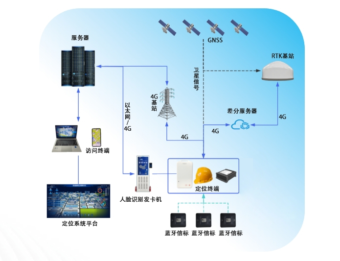 为了克服传统定位系统的局限性,新锐科创自主研发推出北斗RTK+蓝牙+4G融合定位系统。该系统集成了北斗卫星导航系统的高精度定位能力、蓝牙技术的短距离通信优势以及4G网络的实时数据传输特性,实现了露天煤矿全区域、高精度、实时性的人员定位。